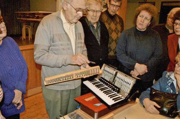 | Kerhon kursseihin sisältyy usein myös haitarien ”sisuksiin” tutustumista. Kuvassa Antti Lehtola ohjaa harmonikan rakenteeseen. Tällaiset kurssit soiton ohessa ovat olleet hyvin suosittuja. |