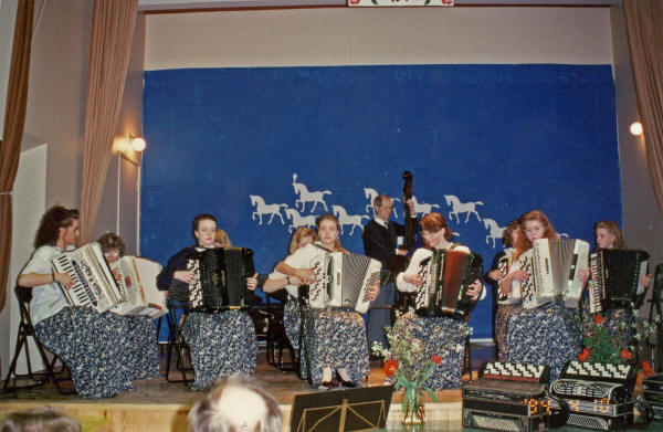 | 10 vuotta tuli täyteen 1994. Juhlakonsertissa soittivat mm. Ruosniemen naisten ryhmä. Ryhmää johti vasemmalla Johanna Suonpää. Toinen vasemmalla on hanurien nykyinen taiteellinen johtaja Satu Salmenaho. Hän on toiminut taiteellisena johtajana syksystä 2007. |
