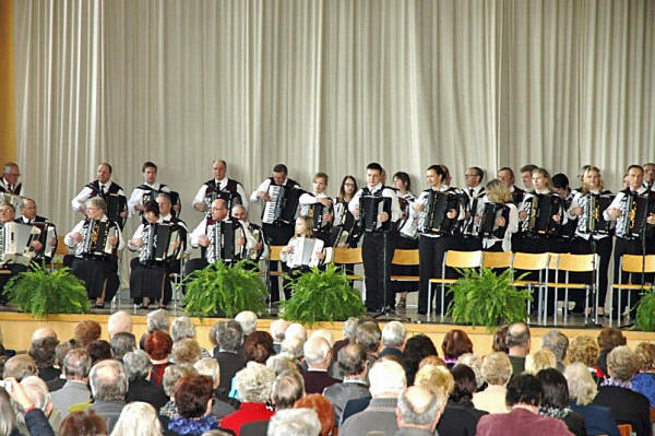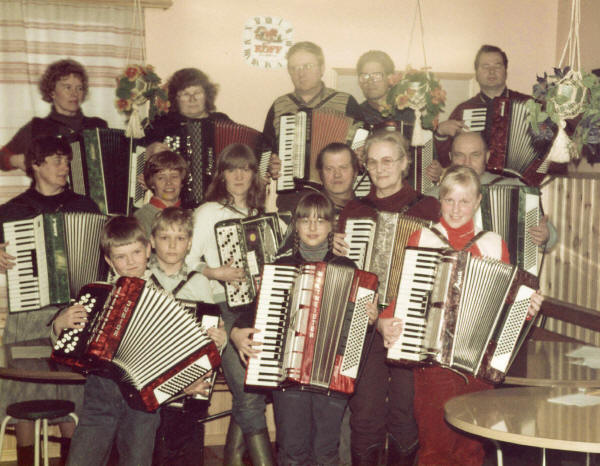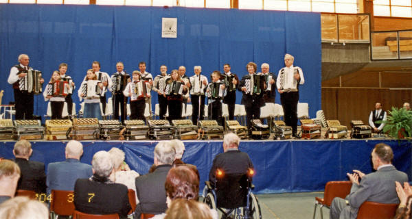 | 20-vuotista kerhoa juhlittiin 2004. Kuvassa oikealla kerhon puheenjohtaja Pekka Muurinen ja vasemmalla kerhon perustaja dir. mus. Antti Lehtola. Mainittakoon, että keskellä punaista pianohaitaria soittaa Timo Hautamäki, joka pelimannimestaruuden lisäksi oli kaksi kertaa Kultaisen harmonikkamestaruuskilpailun hopeamitalisti. |