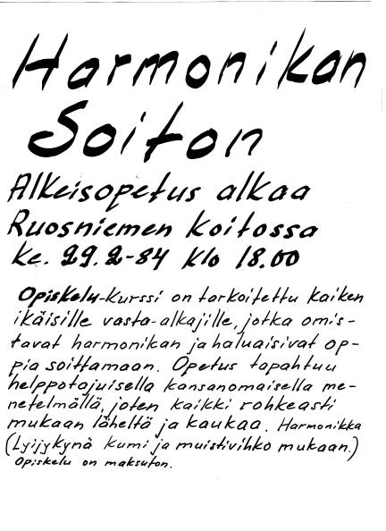 Yllä olevasta tolppailmoituksesta Ruosniemen hanurien toiminta alkoi 29.2.1984. Mukaan ilmoittautui 24 soitonhaluista hanuristioppilasta. Kurssin jälkeen todettiin, että aikuisetkin oppivat nuotit ja soittamisen taidon. .